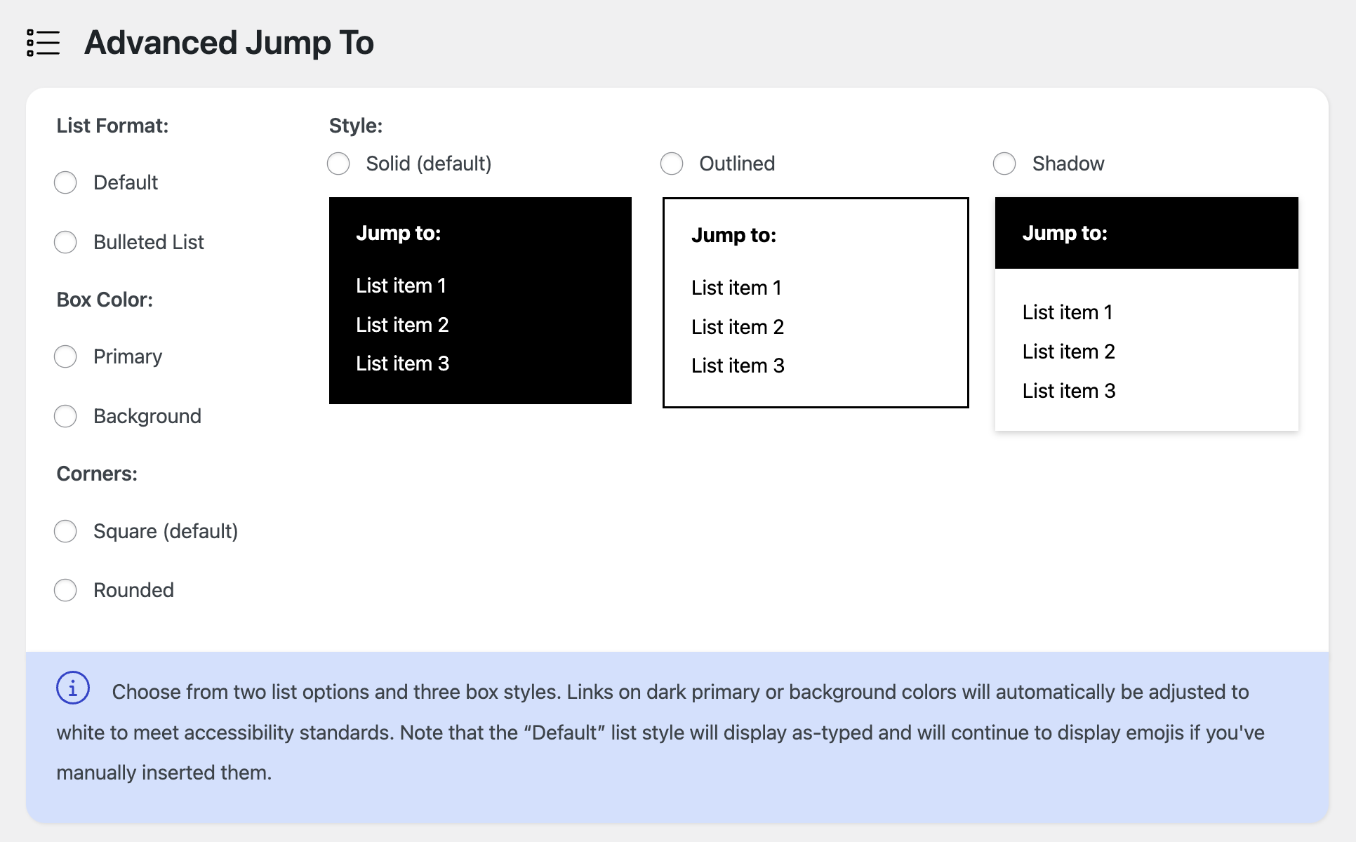 Feast+ styling is automatically applied to theย Advanced Jump Toย block. The style is determined by the style you select under "Advanced Jump To" on the Feast+ Branding page.