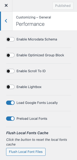 If your fonts aren't showing up, or bold/italics are not displaying correctly, you may need to use the Flush Local Fonts Cache under Customizer > General > Performance: